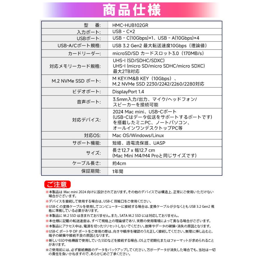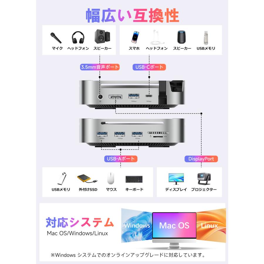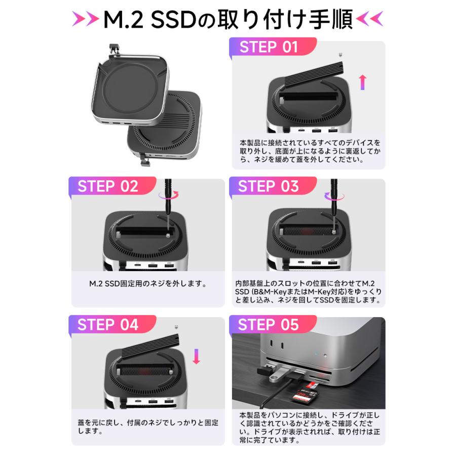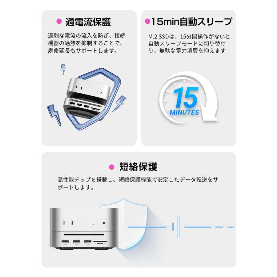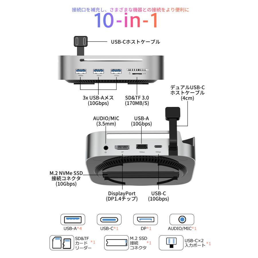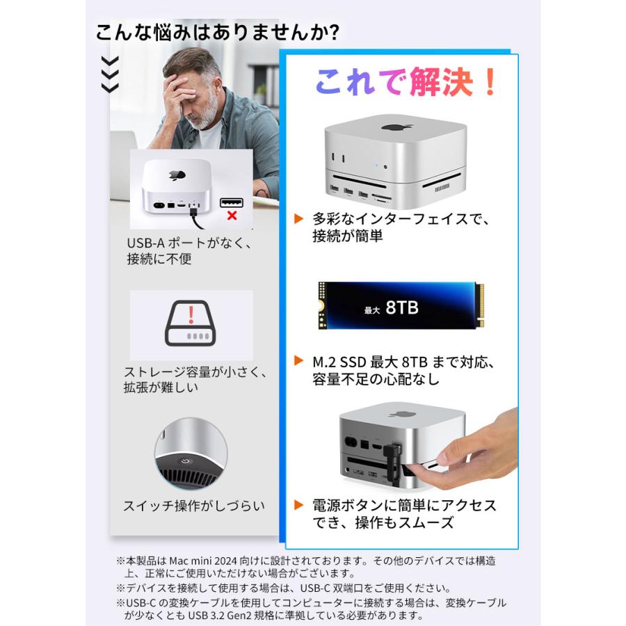 | ※本製品は Mac mini 2024 向けに設計されております。その他のデバイスでは構造上、正常にご使用いただけない場合がございます。 ※デバイスを接続して使用する場合は、USB-C 双端口をご使用ください。 ※USB-C の変換ケーブルを使用してコンピューターに接続する場合は、変換ケーブルが少なくとも USB 3.2 Gen2 規格に準拠している必要があります。 ※本製品に M.2 SSD は含まれておりません。また、SATA M.2 SSD には対応しておりません。 ※本仕様に記載の転送速度は、すべて規格上の理論値であり、実際の使用環境によって異なる場合がございます。 ※本製品にアクセス中は、電源を切ったりリセットしないでください。故障やデータの破損・消失の原因となります。 ※USB-C ポートや DP ポートをご使用の際は、向きや順序を確認のうえ正しく接続してください。無理に挿し込むと、端子の破損や接続不良の原因となります。 ※新しいSSDや他機器で使用していたSSDなどを接続する場合、OS上で初期化またはフォーマットが求められることがあります。 ※ご使用前には、必ず接続機器のデータをバックアップしてください。万が一データが消失した場合でも、当社は一切の責任を負いかねますので、あらかじめご了承ください。 |