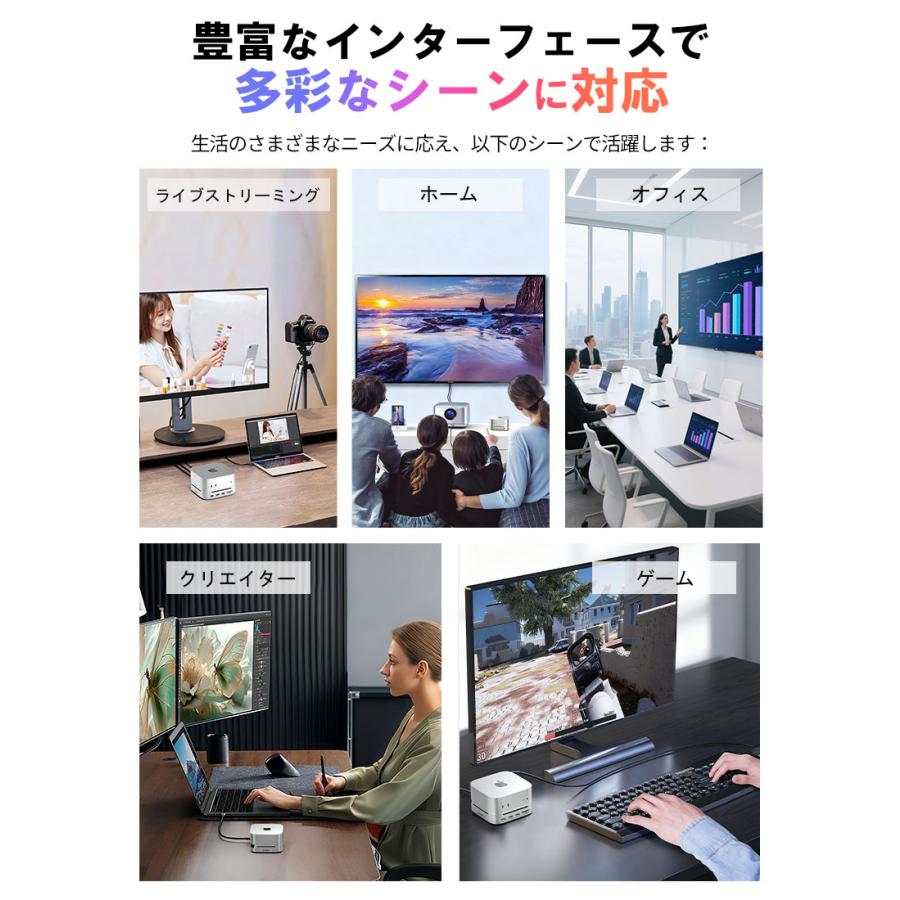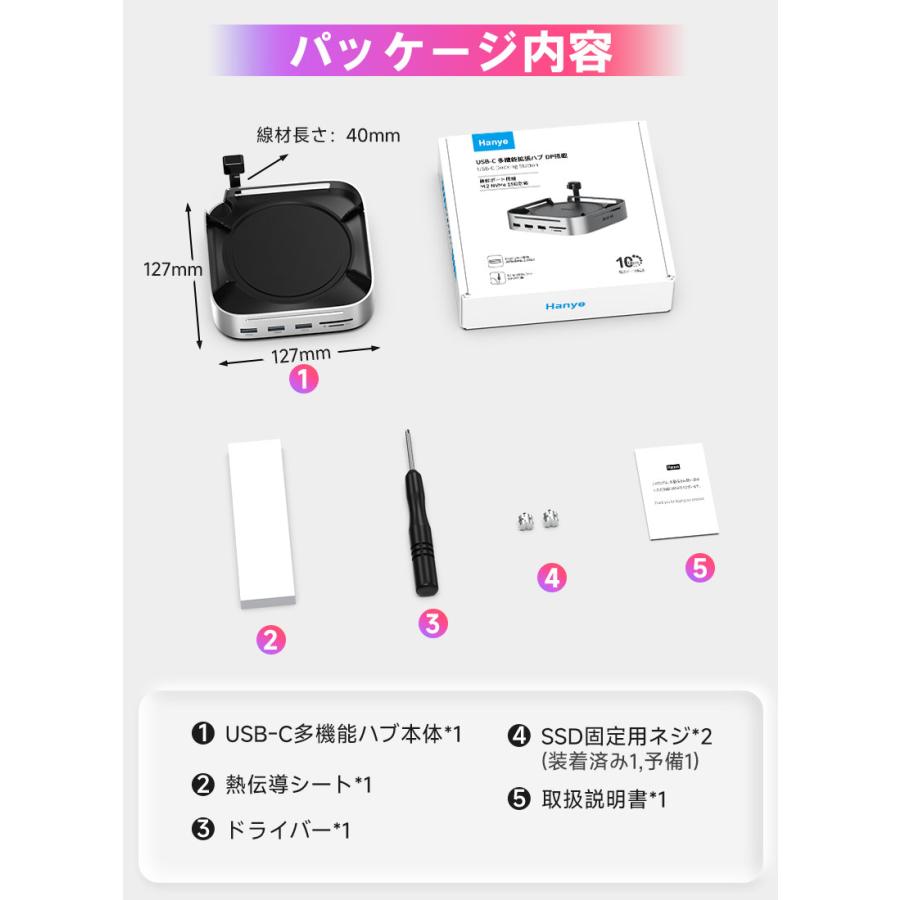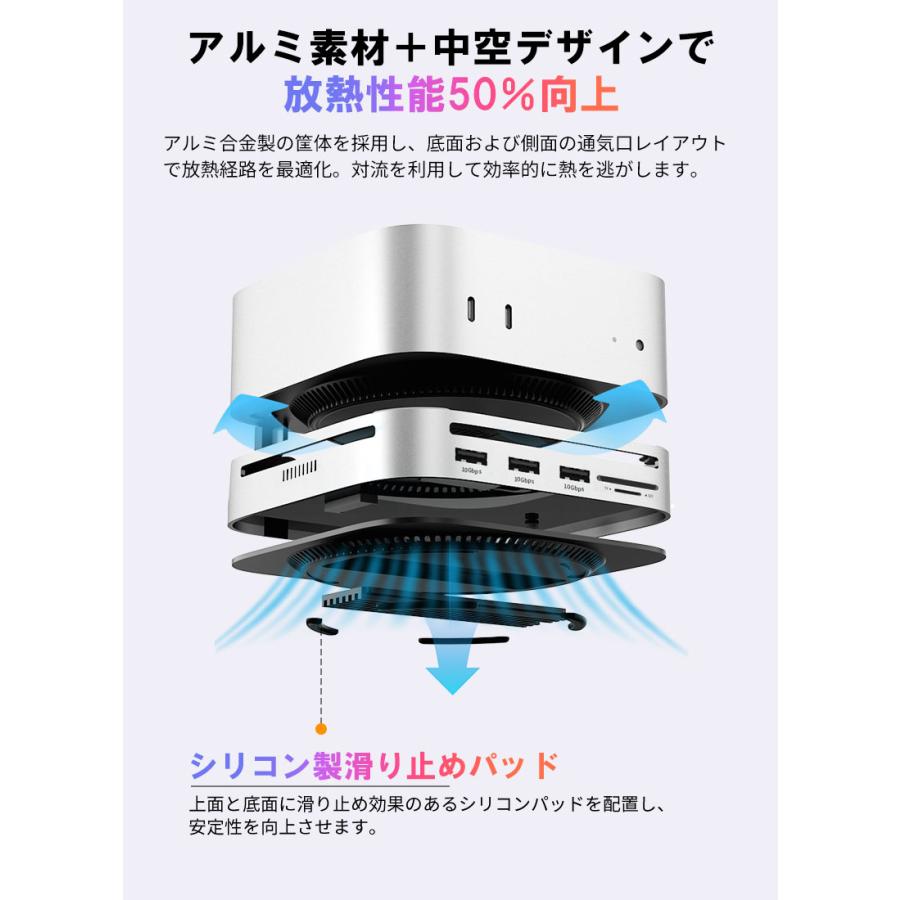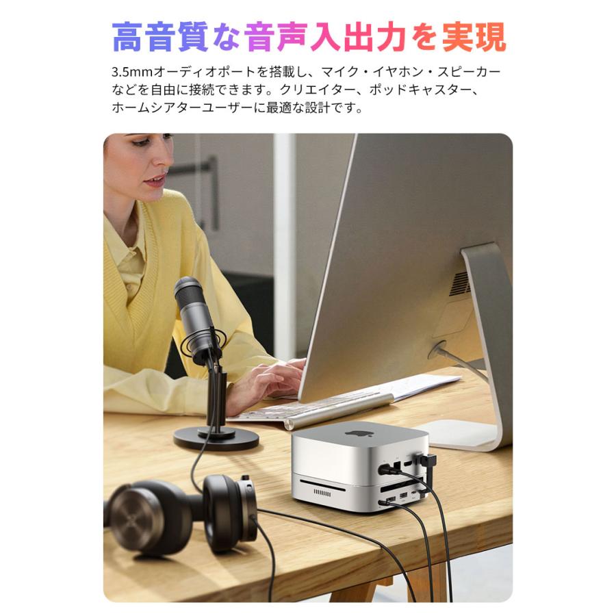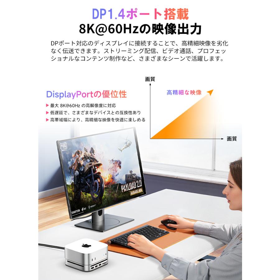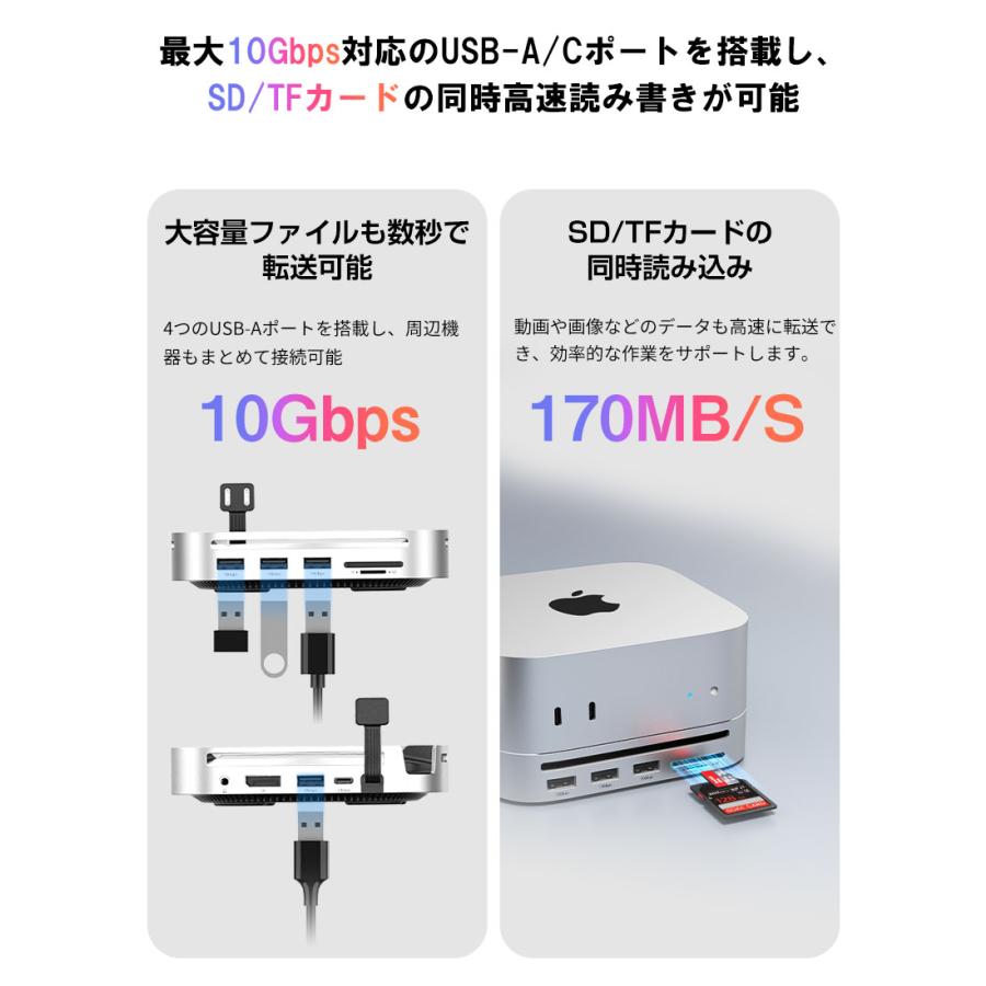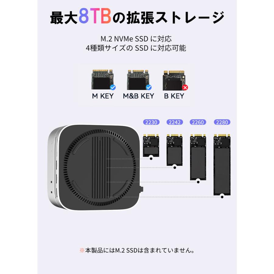 | ※本製品は Mac mini 2024 向けに設計されております。その他のデバイスでは構造上、正常にご使用いただけない場合がございます。 ※デバイスを接続して使用する場合は、USB-C 双端口をご使用ください。 ※USB-C の変換ケーブルを使用してコンピューターに接続する場合は、変換ケーブルが少なくとも USB 3.2 Gen2 規格に準拠している必要があります。 ※本製品に M.2 SSD は含まれておりません。また、SATA M.2 SSD には対応しておりません。 ※本仕様に記載の転送速度は、すべて規格上の理論値であり、実際の使用環境によって異なる場合がございます。 ※本製品にアクセス中は、電源を切ったりリセットしないでください。故障やデータの破損・消失の原因となります。 ※USB-C ポートや DP ポートをご使用の際は、向きや順序を確認のうえ正しく接続してください。無理に挿し込むと、端子の破損や接続不良の原因となります。 ※新しいSSDや他機器で使用していたSSDなどを接続する場合、OS上で初期化またはフォーマットが求められることがあります。 ※ご使用前には、必ず接続機器のデータをバックアップしてください。万が一データが消失した場合でも、当社は一切の責任を負いかねますので、あらかじめご了承ください。 |