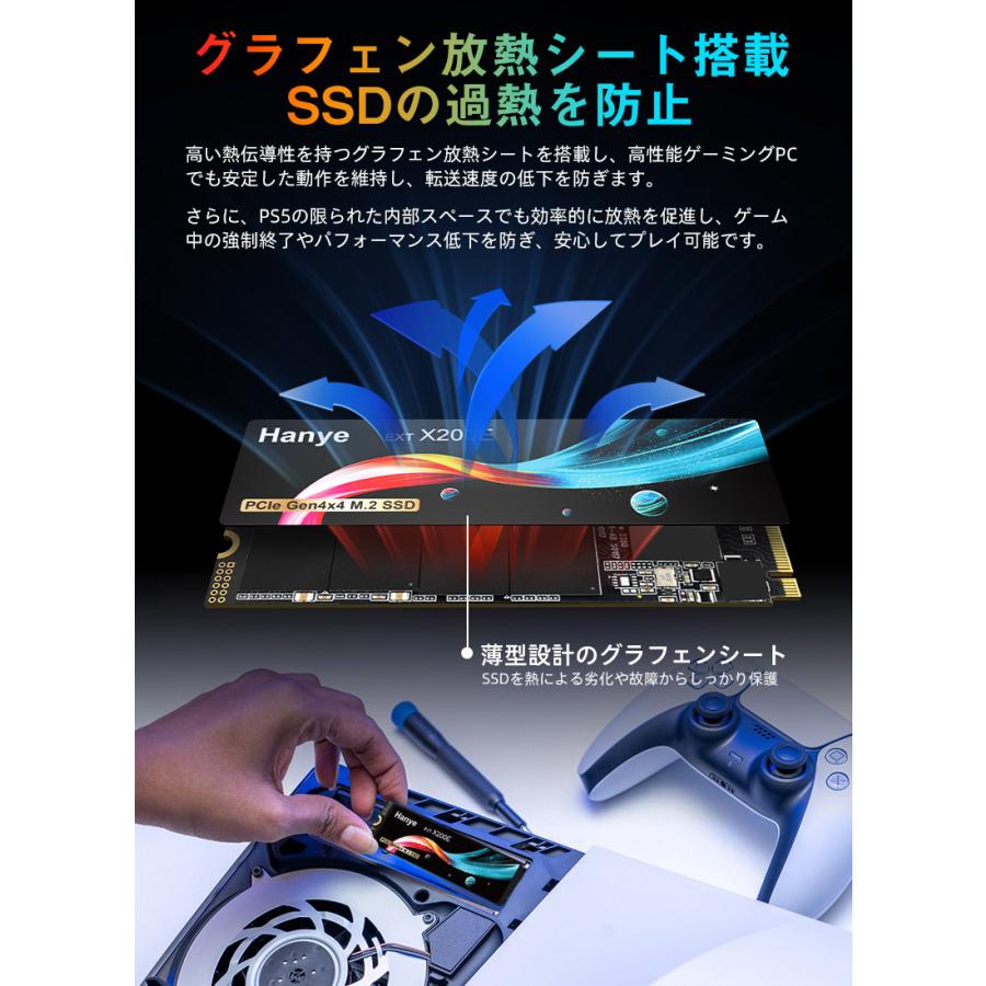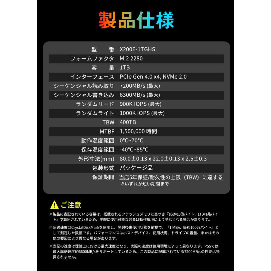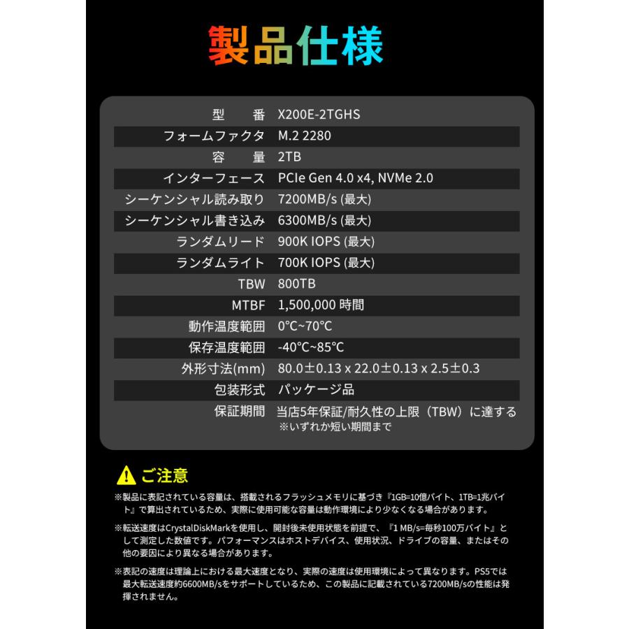 | ※転送速度はCrystalDiskMarkを使用し、開封後未使用状態を前提で、『1 MB/s=毎秒100万バイト』として測定した数値です。パフォーマンスはホストデバイス、使用状況、ドライブの容量、またはその他の要因により異なる場合があります。 ※表記の速度は理論上における最大速度となり、実際の速度は使用環境によって異なります。PS5では最大転送速度約6600MB/sをサポートしているため、この製品に記載されている7200MB/sの性能は発揮されません。 |