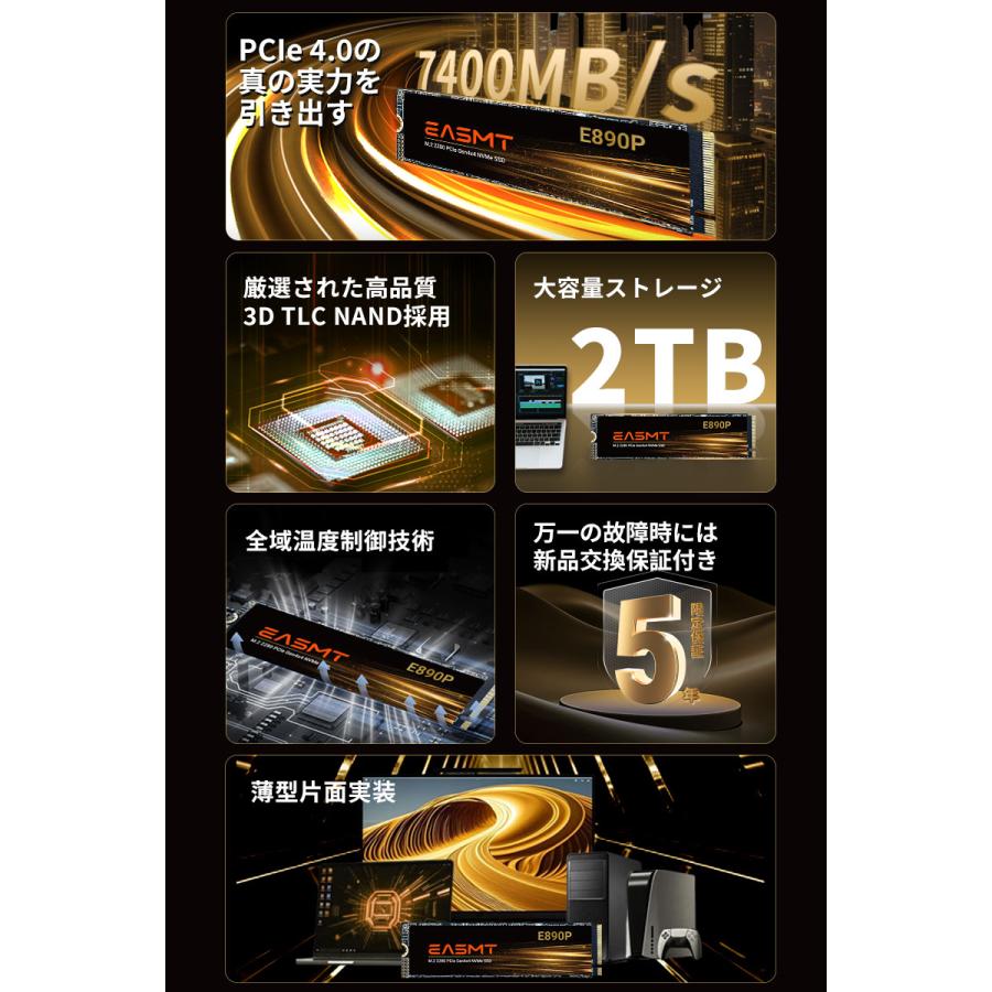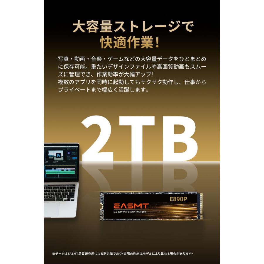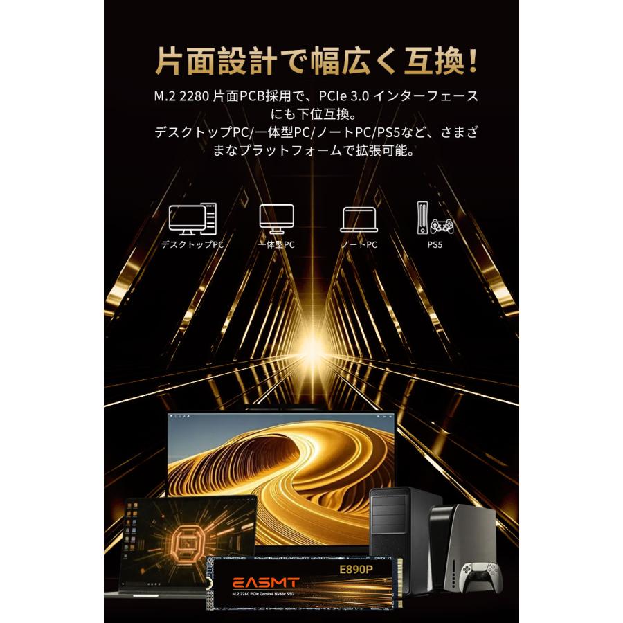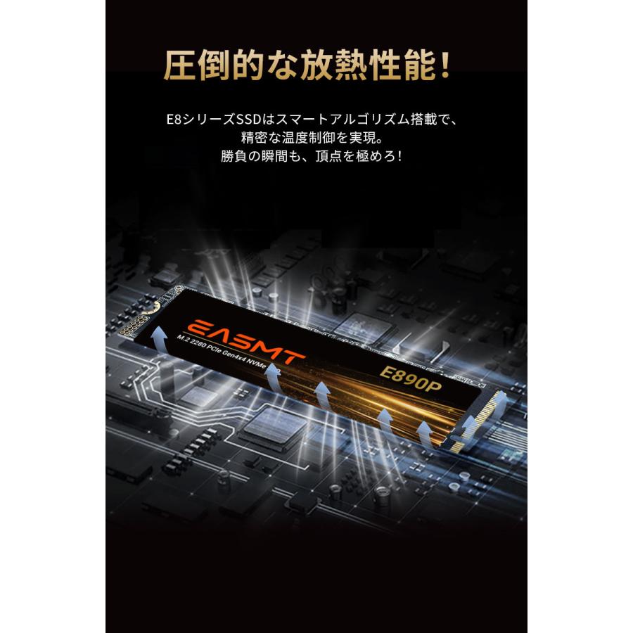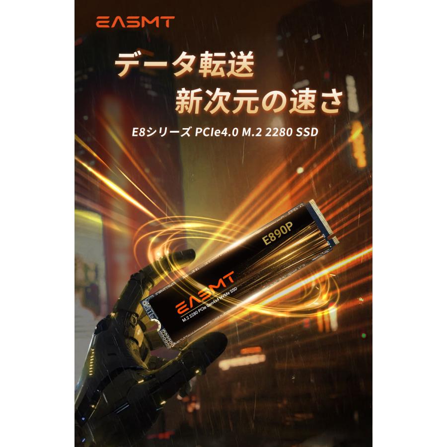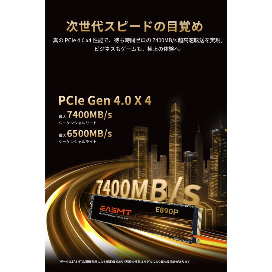 EASMT E890Pシリーズは、最新規格PCIe 4.0×4インターフェースに対応し、最大7400MB/sの読み込み・6500MB/sの書き込み速度を実現。