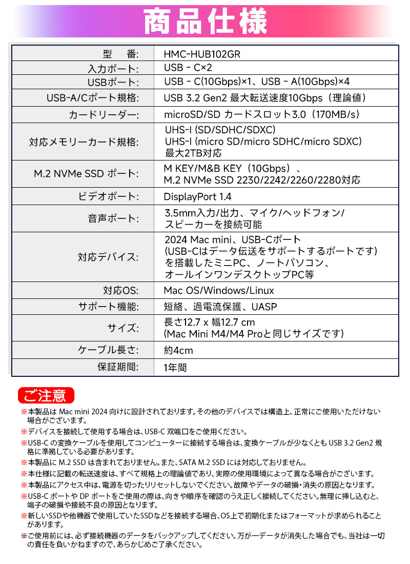 | ※本製品は Mac mini 2024 向けに設計されております。その他のデバイスでは構造上、正常にご使用いただけない場合がございます。 ※デバイスを接続して使用する場合は、USB-C 双端口をご使用ください。 ※USB-C の変換ケーブルを使用してコンピューターに接続する場合は、変換ケーブルが少なくとも USB 3.2 Gen2 規格に準拠している必要があります。 ※本製品に M.2 SSD は含まれておりません。また、SATA M.2 SSD には対応しておりません。 ※本仕様に記載の転送速度は、すべて規格上の理論値であり、実際の使用環境によって異なる場合がございます。 ※本製品にアクセス中は、電源を切ったりリセットしないでください。故障やデータの破損・消失の原因となります。 ※USB-C ポートや DP ポートをご使用の際は、向きや順序を確認のうえ正しく接続してください。無理に挿し込むと、端子の破損や接続不良の原因となります。 ※新しいSSDや他機器で使用していたSSDなどを接続する場合、OS上で初期化またはフォーマットが求められることがあります。 ※ご使用前には、必ず接続機器のデータをバックアップしてください。万が一データが消失した場合でも、当社は一切の責任を負いかねますので、あらかじめご了承ください。 |